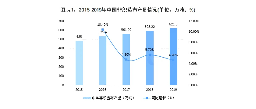 近年來,非織造布行業(yè)在中國發(fā)展迅猛,我國已成為全球較大的非織造布生產(chǎn)國與消費(fèi)國。2018年,中國非織造布生產(chǎn)總量達(dá)到593.22萬噸,占全球非織造布生產(chǎn)總量的37.91%,同比增長5.7%。同時,2019年行業(yè)規(guī)模以上企業(yè)的非織造布產(chǎn)量達(dá)到503萬噸,同比增長9.9%。根據(jù)中國產(chǎn)業(yè)用紡織品行業(yè)協(xié)會的數(shù)據(jù)顯示,2019年中國非織造布產(chǎn)量達(dá)到621.3萬噸。