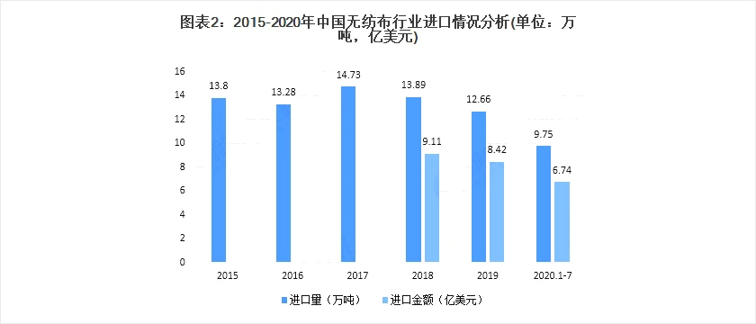 近年來,我國無紡布進(jìn)口額和進(jìn)口數(shù)量均呈現(xiàn)波動變化。2019年,中國無紡布行業(yè)進(jìn)口數(shù)量為12.66萬噸,進(jìn)口額達(dá)到8.42億美元。由于新冠肺炎疫情的影響,我國無紡布在2020年1-7月的進(jìn)口金額為6.74億美元,進(jìn)口數(shù)量為9.75萬噸。